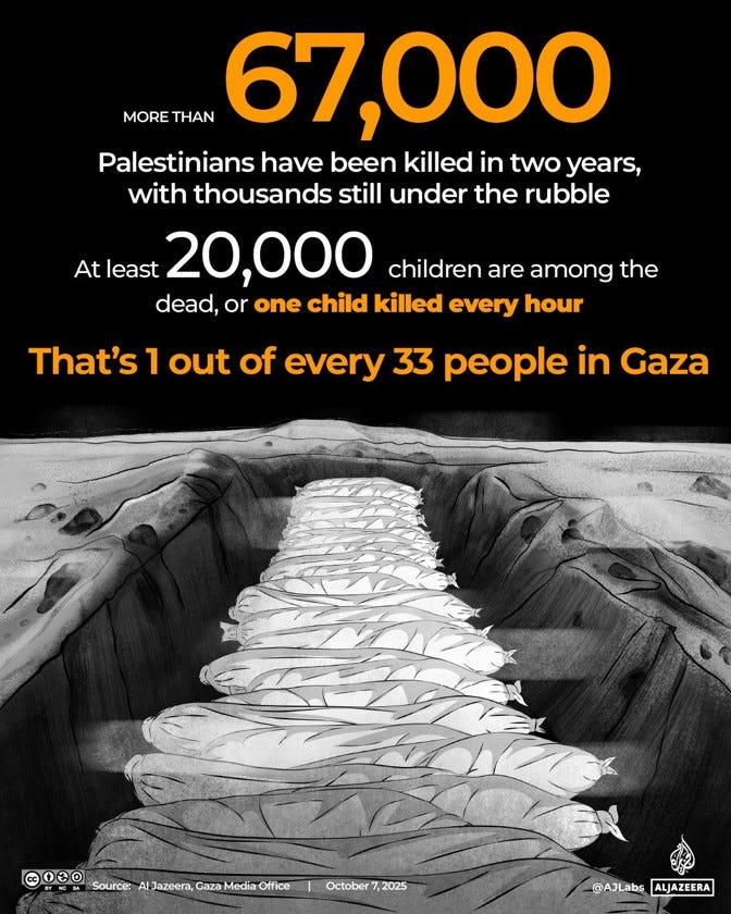 Since October 2023, over 67,000 Palestinians have been killed by Israeli attacks. Thousands more are under the rubble. “At least 20,000 children are among the dead, or one child killed every hour for the past 24 months,” according to a recent Al Jazeera article.
