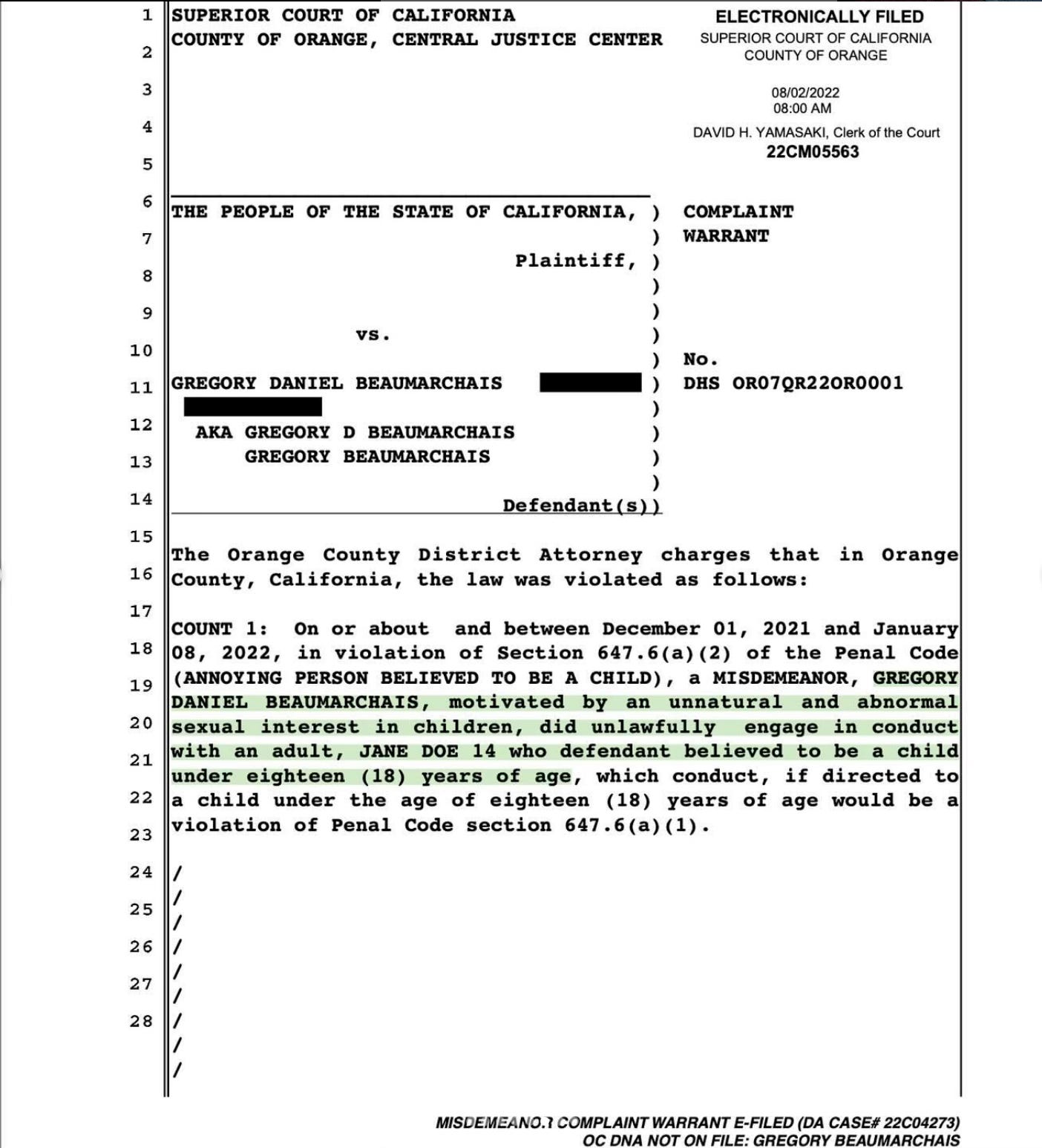 “GREGORY DANIEL BEAUMARCHAIS, motivated by an unnatural and abnormal sexual interest in children, did unlawfully engage in conduct with an adult, JANE DOE 14 who defendant believed to be a child under eighteen (18) years of age…” -the court’s warrant