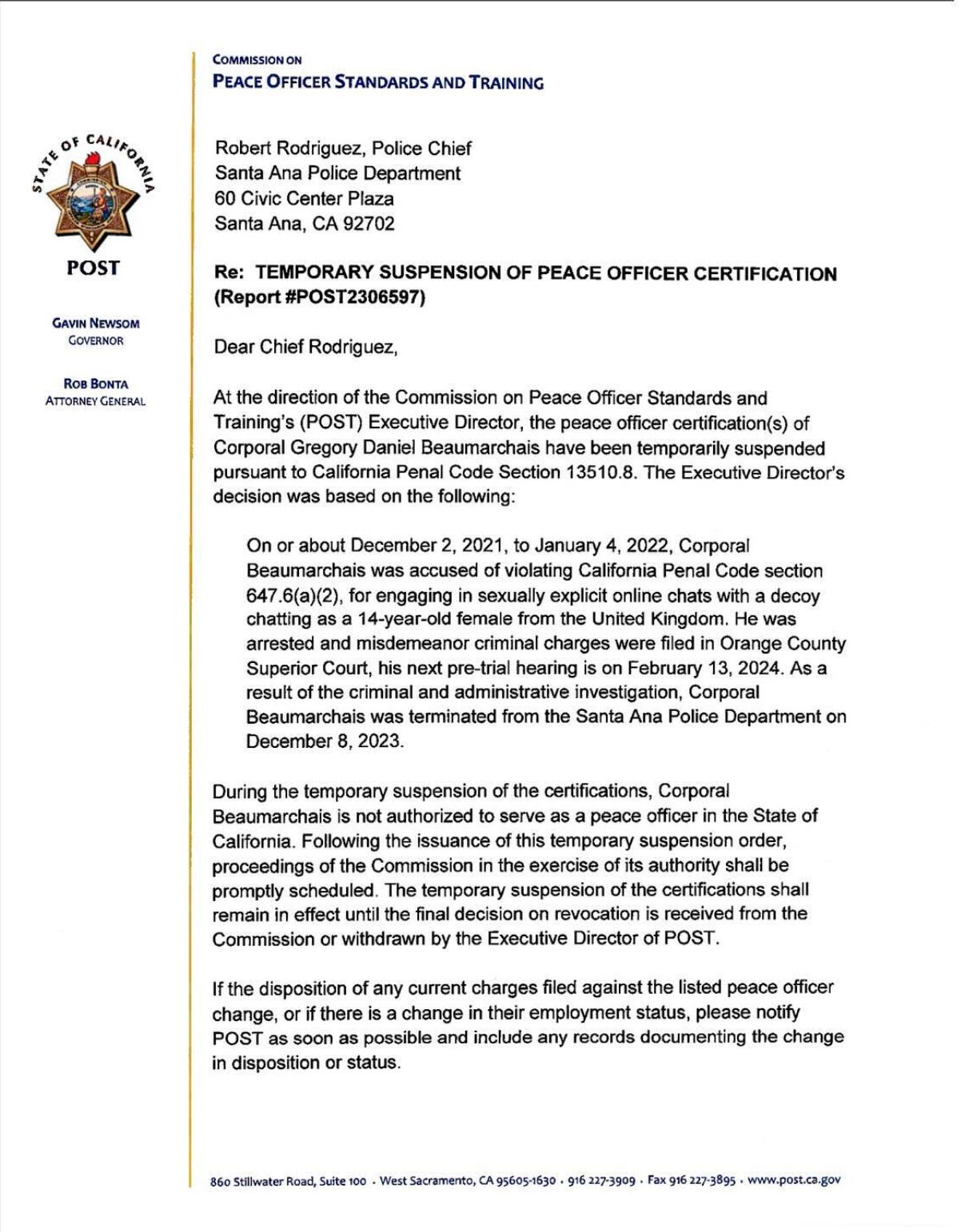 Gregory Daniel Beaumarchais, Santa Ana Police Department’s 2019 Detective of the Year, has been temporarily banned from working as a police officer in the State of California. In late 2021 to early 2022, Beaumarchais sent graphic messages to someone he believed to be a child, but turned out that they were a decoy working with the Department of Homeland Security (DHS).