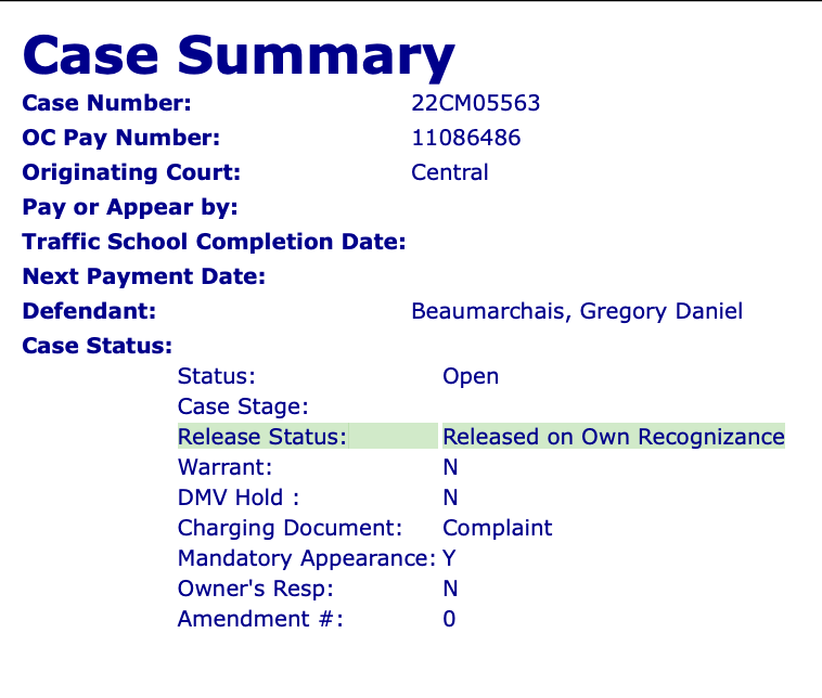 On August 2nd, 2022, the court issued an arrest warrant for Beaumarchais. His bail was set to $500. During a hearing that afternoon, after turning himself in, the court recalled the warrant and allowed Beaumarchais to be released. He deferred his arraignment for over a year. On October 18th, 2023, he pled “not guilty”.